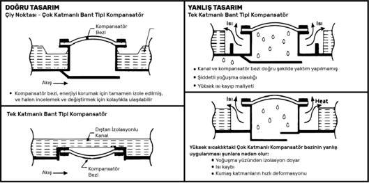 Kumaş katmanlı kompansatörler kanal sisteminde esneklik sağlar ve 4 ana duruma izin vermek için