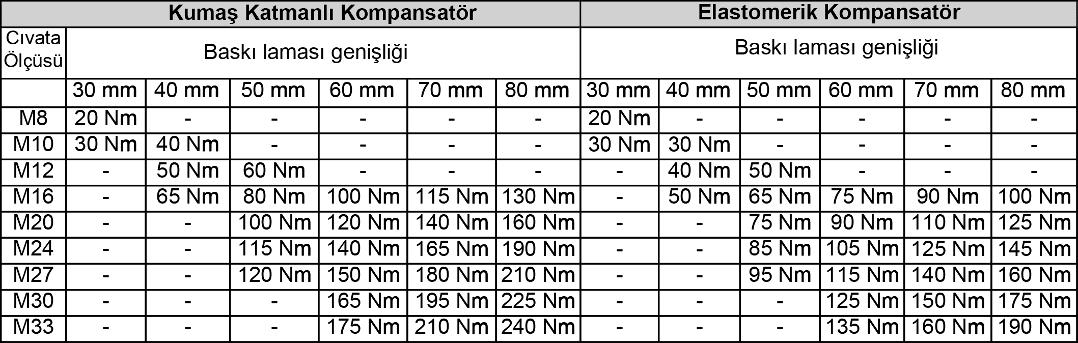 Baca gazı sızdırmazlığı (TI-002) veya nekal sızdırmazlığı (TI-003) elde etmek için kullanılan cıvata yükleme tablosu aşağıdaki gibidir. (MoS2