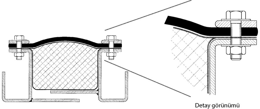 Esnek elemanın dik açılarda oluşturulmuş flanşlara sahip kompansatör bezi konfigürasyonudur.